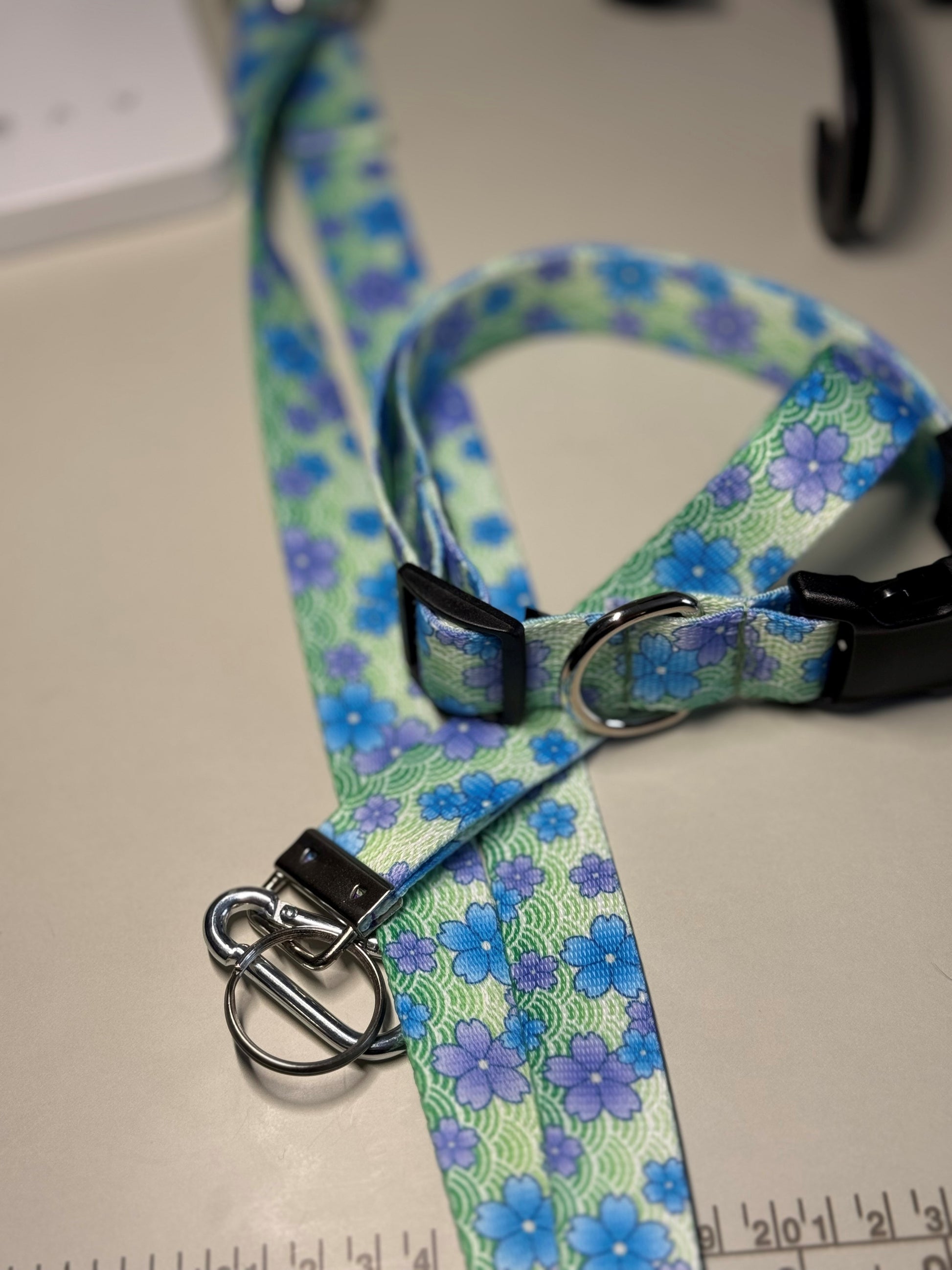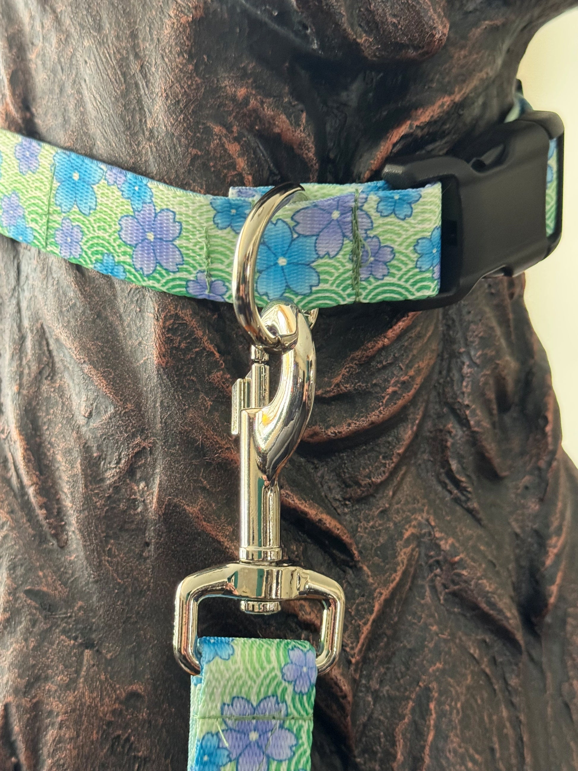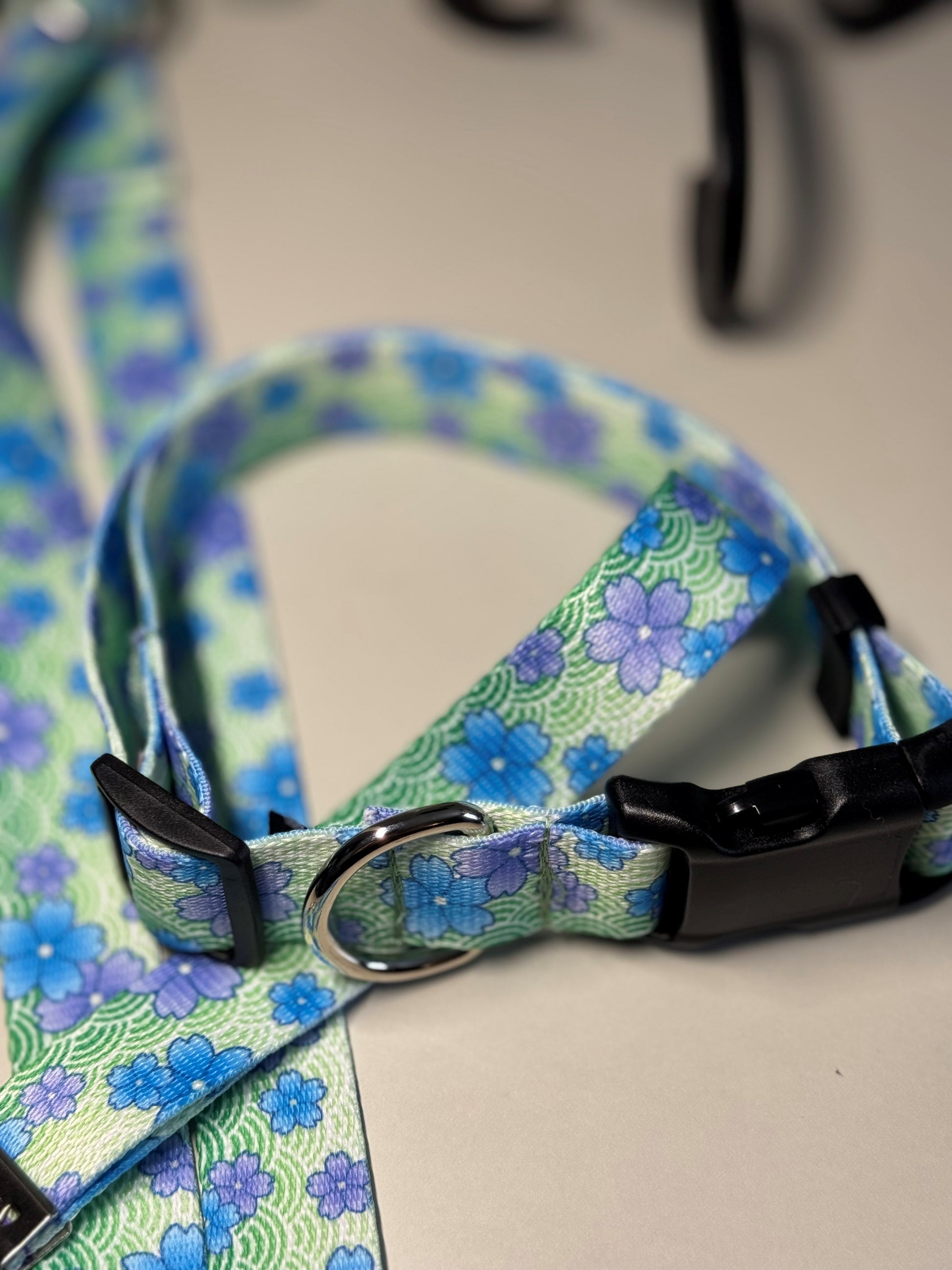 Green, purple, and blue hues set the scene for a sunny April day. Photo Quality Polyester, Plastic Buckle, Metal Welded D-Ring. Strong and Durable. Dog Leashes, Dog Collars, Wristlet Keychain.