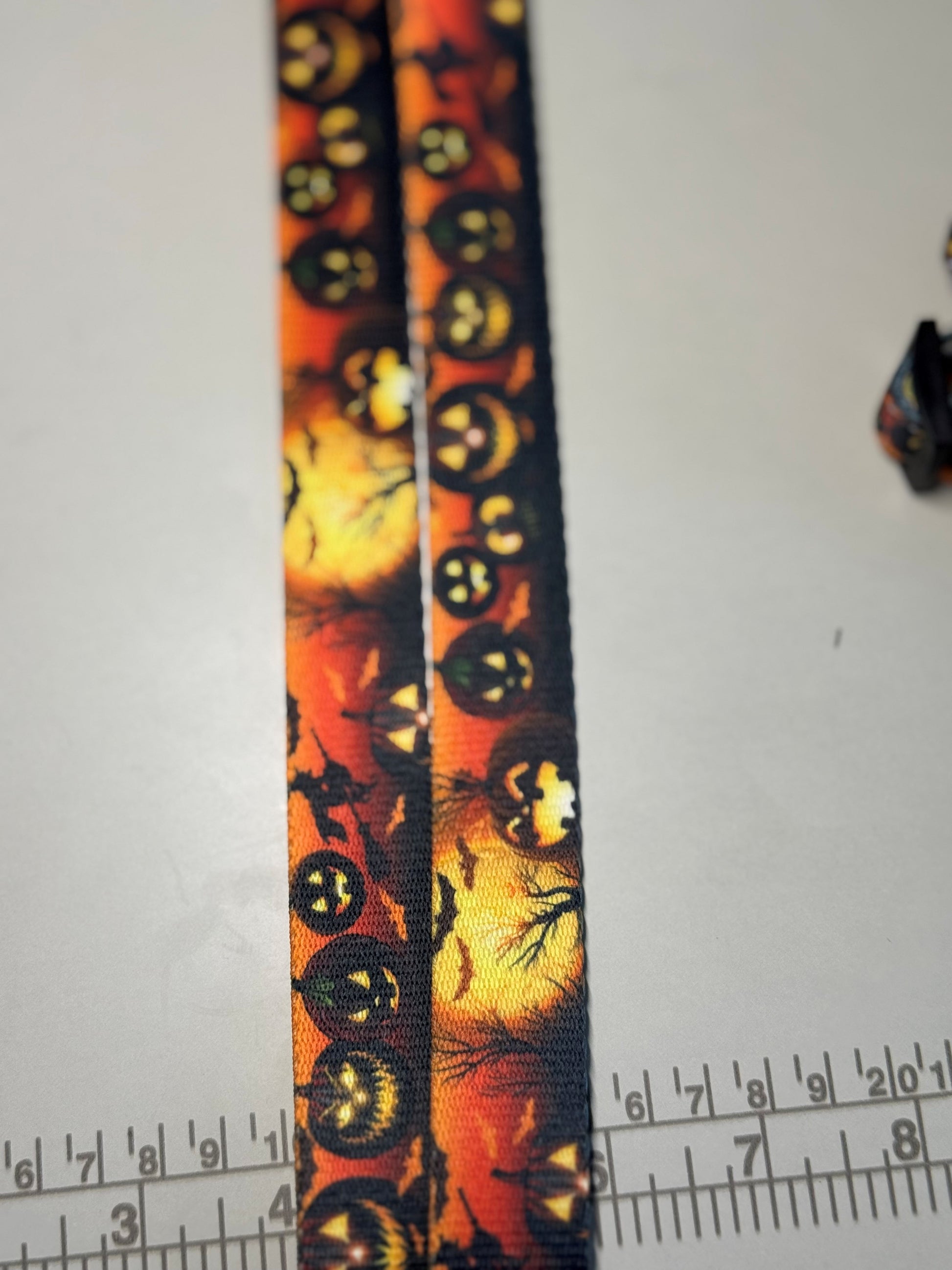 This pattern is what nightmares are made of. Scary Halloween pumpkins glow with orange against the pitch black sky. Photo Quality Polyester, Plastic Buckle, Metal Welded D-Ring. Strong and Durable. Dog Leashes, Dog Collars, Wristlet Keychain.
