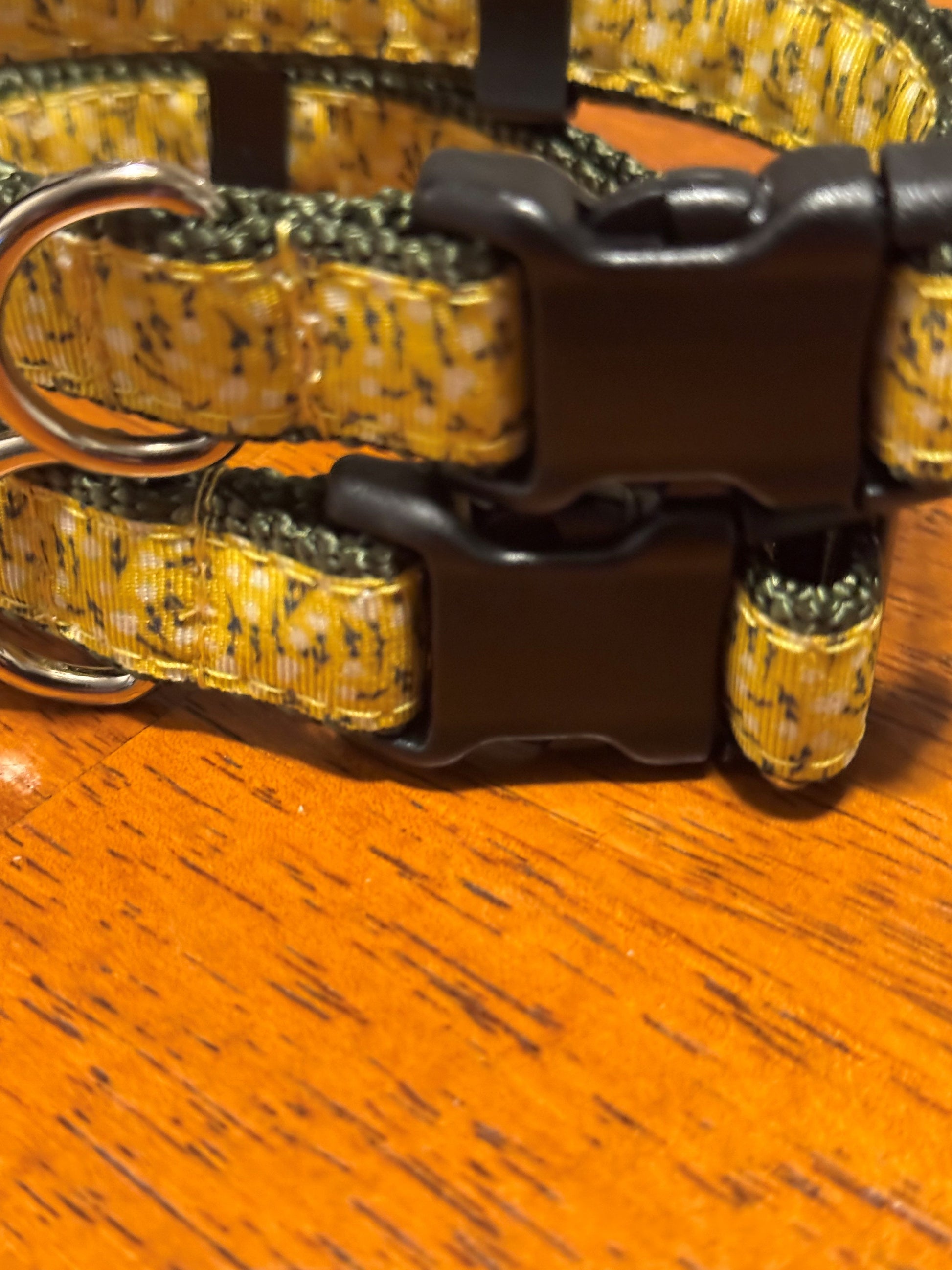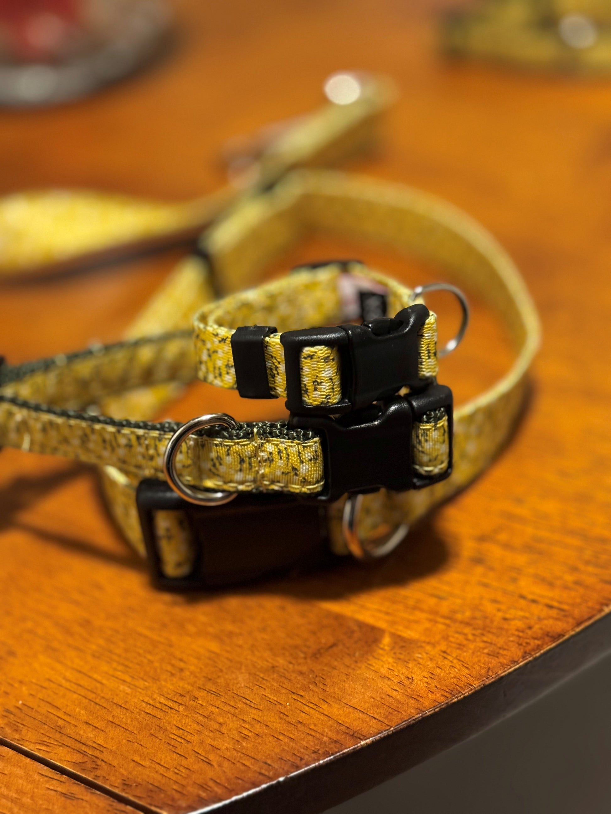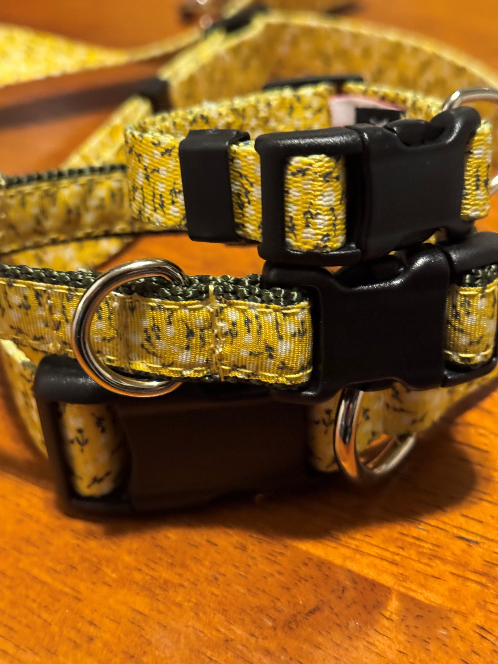 The mustard yellow background sets a calming tone as the arranged spring flowers bring a romanticized aura. Photo Quality Polyester, Plastic Buckle, Metal Welded D-Ring, Strong and Durable. Made in the USA. Dog Leashes, Dog Collars, Wristlet Keychain.