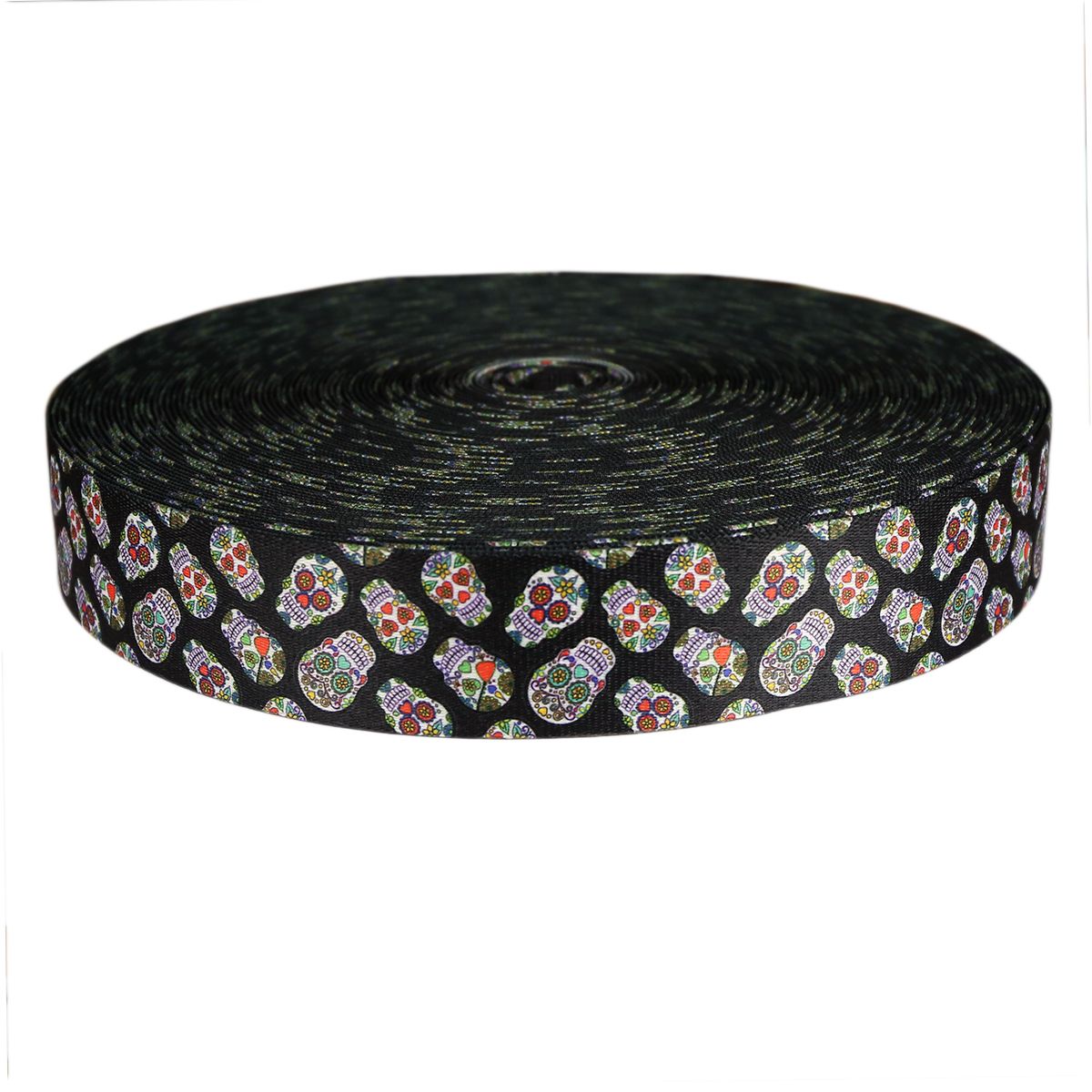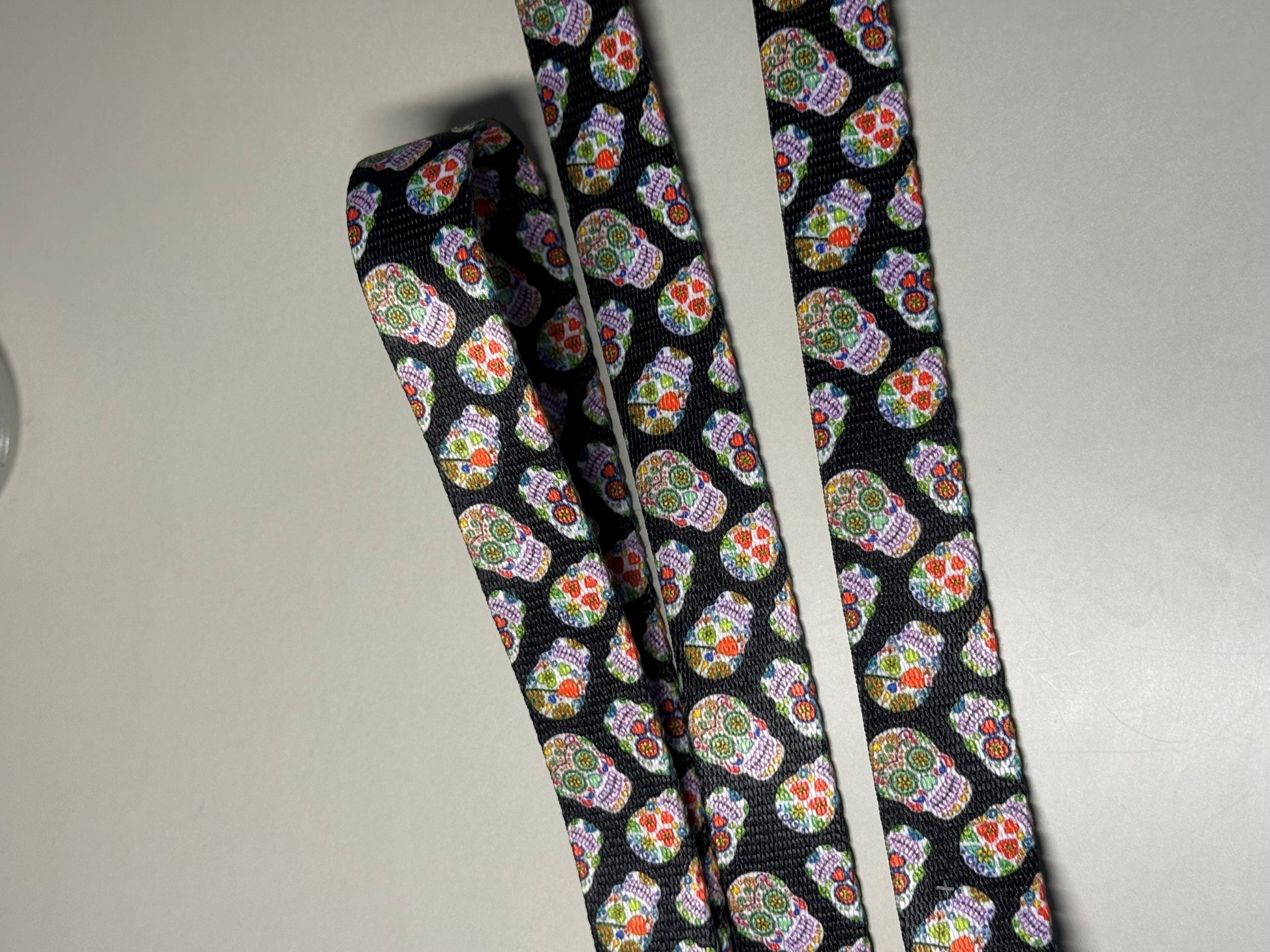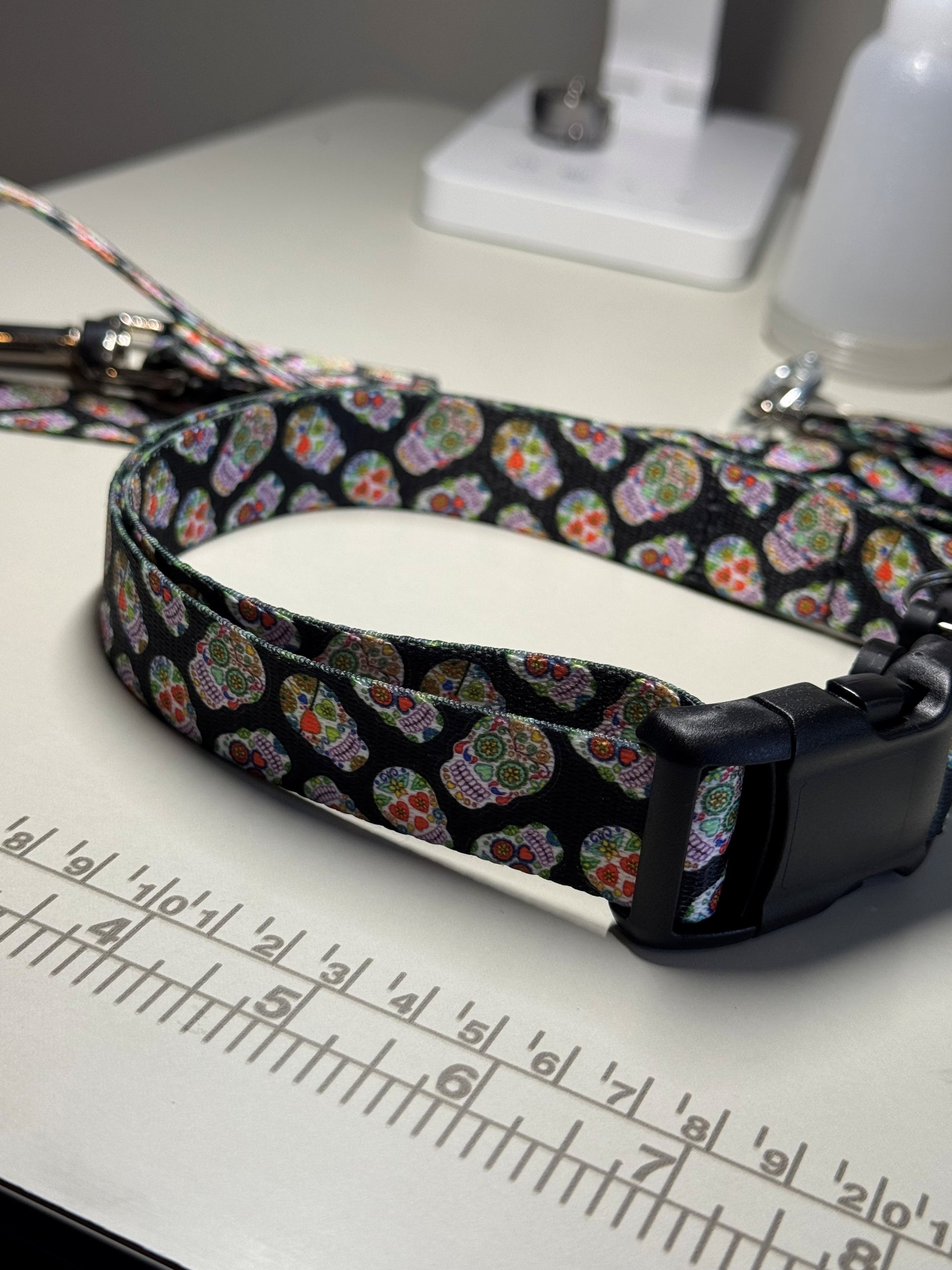Multi colored skulls on black webbing. Photo quality polyester webbing 1" plastic buckle, metal welded D-ring, strong and durable. Dog Leashes, Dog Collars, Wristlet Keychain