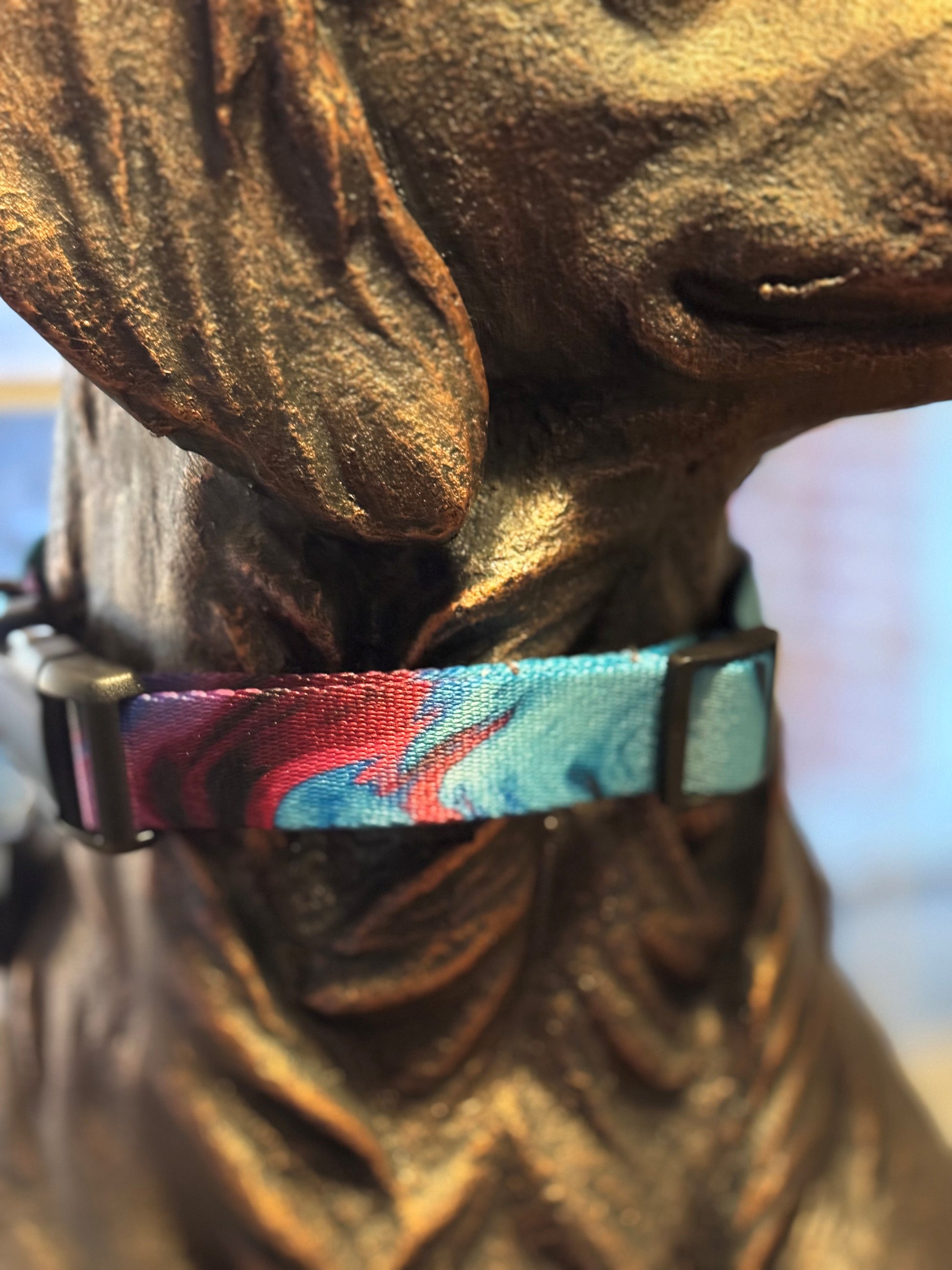 Shades of purples and blues. Photo quality polyester webbing 1" plastic buckle, metal welded D-ring, strong and durable. Dog Leashes, Dog Collars, Wristlet Keychain